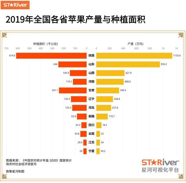 从数据上来看,2019年陕西省苹果果园面积614.6千公顷,占据陕西省果业半壁江山。2019年陕西省苹果产量1135.6万吨。
