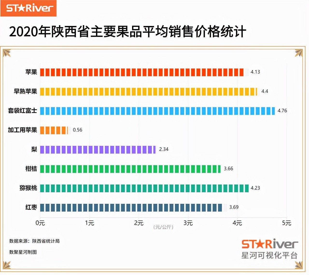 2020年陕西省苹果平均销售价格为4.13元/公斤;早熟苹果平均销售价格为4.4元/公斤;套袋红富士平均销售价格为4.76元/公斤;加工用苹果平均销售价格为0.56元/公斤;梨平均销售价格为2.34元/公斤;柑桔平均销售价格为3.66元/公斤;猕猴桃平均销售价格为4.23元/公斤;红枣平均销售价格为3.69元/公斤。
