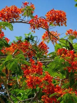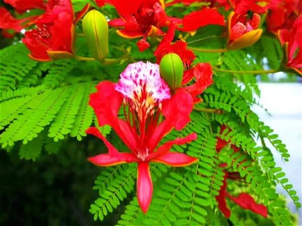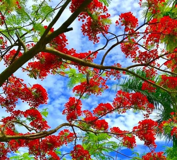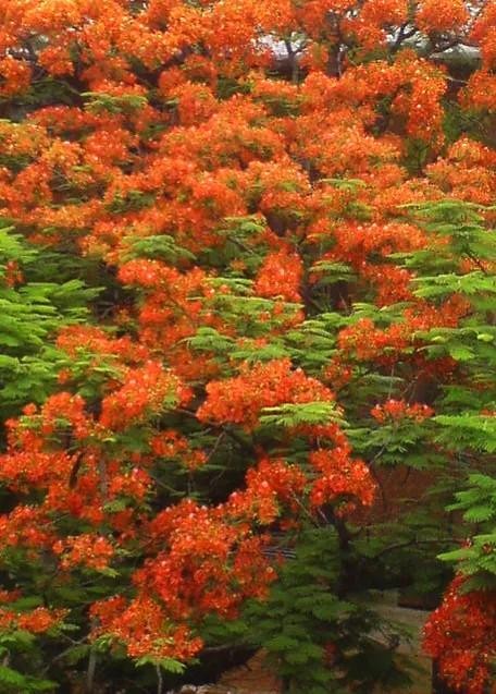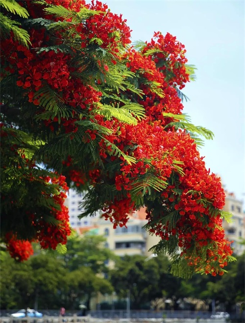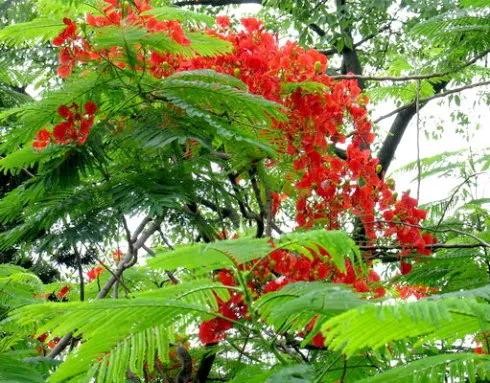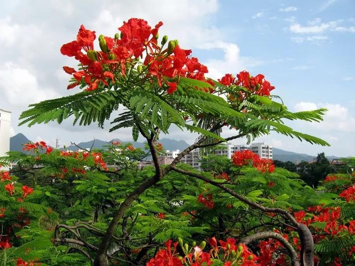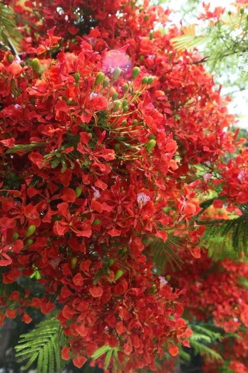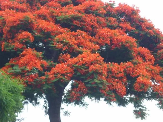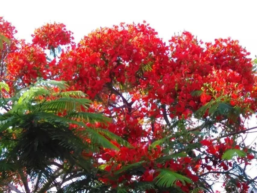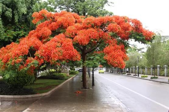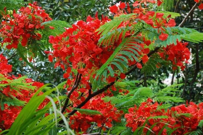凤凰树别名金凤花,红花楹树,其花多为鲜红或橙色,花大而美丽,有光泽,花开时节花红叶绿,满树如火,热烈奔放。是世界上色彩最鲜艳的树木之一。