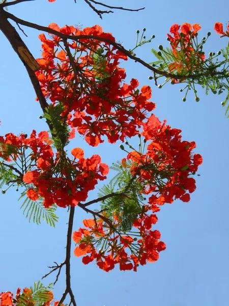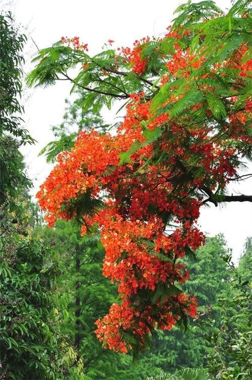 凤凰树,也就是凤凰木,为高大落叶乔木,树冠扁圆形,分枝多而开展,因“叶如飞凰之羽,花若丹凤之冠”而取名凤凰树。