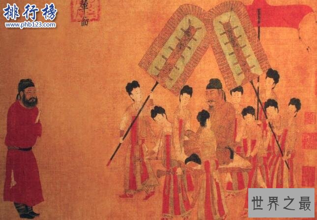 步辇图是唐朝最受敬爱的中国国画家之一阎立本所作,被收藏在北京故宫博物院中,这幅画是博物院中最具艺术价值的作品。这幅画长129.6厘米,宽38.5厘米,花在坚硬的丝绸之上,描绘了在公元640年禄东赞朝见唐太宗时的场景。现存画作被认为是宋朝摹本。