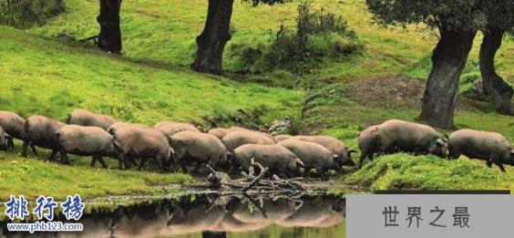 西班牙伊比利亚黑猪一般都在森林里长大,在橡树果林中放养,不仅吃精心调配的绿色饲料,还吃了大量的橡果,所以它们的肉质比一般的更加鲜美,甚至带有橡果的味道,不仅好吃而且健康,西班牙知名火腿原料就是这种黑猪,因为猪肉价格比较昂贵,所以火腿也是比较不菲的。