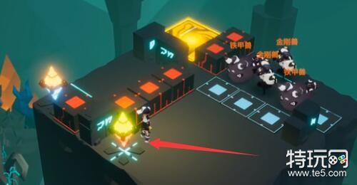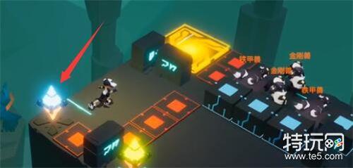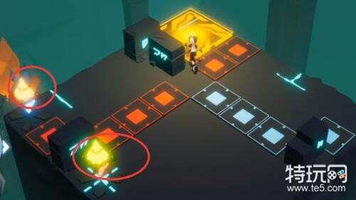 3、开启机关,把中间的升降机降下去,再走到左边开启蓝色的机关,把怪围在里面。(如下图)