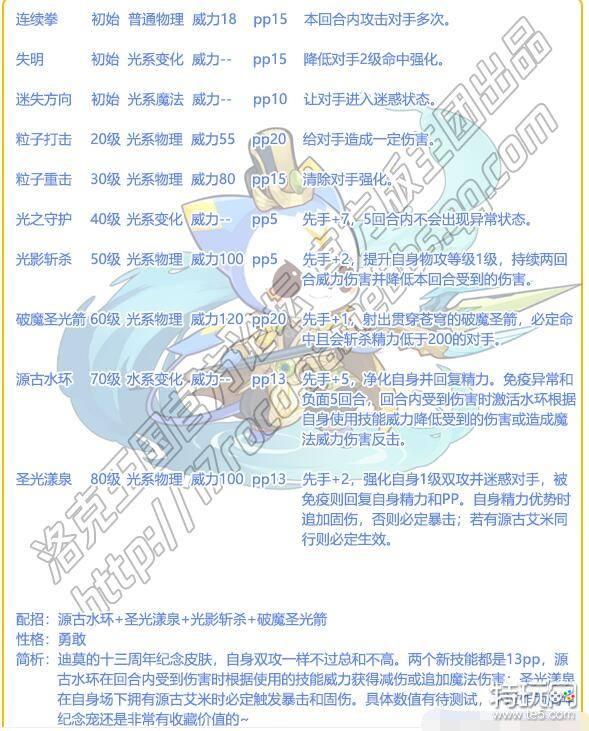 3、迪莫的十三周年纪念皮肤,自身双攻一样不过总和不高。两个新技能都是13pp,源古水环在回合内受到伤害时根据使用的技能威力获得减伤或追加魔法伤害。