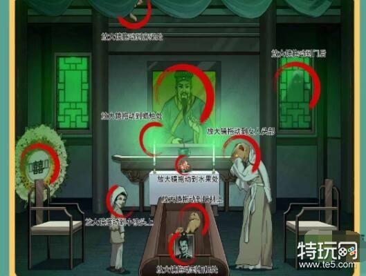 4、移动放大镜到棺材上找到黄鼠狼;移动放大镜到相框处找到相片人