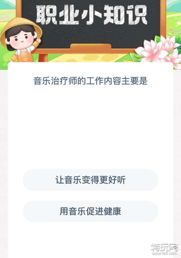 2023支付宝蚂蚁新村3月21的题目已经更新了,今天的题目为:音乐治疗师的工作内容主要是?正确答案是什么?让音乐变得更好听还是用音乐促进健康呢?很多小伙伴可能还不太清楚。下面小编就为大家带来了正确答案分享,希望能帮助到你。