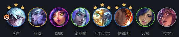 阵容成员:李青+亚索+妮蔻+奇亚娜+沃利贝尔+斯维因+艾希+卡尔玛