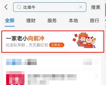 1、打开支付宝app,点击首页上方搜索框,输入:比谁牛,找到活动“一家老少向前冲”。