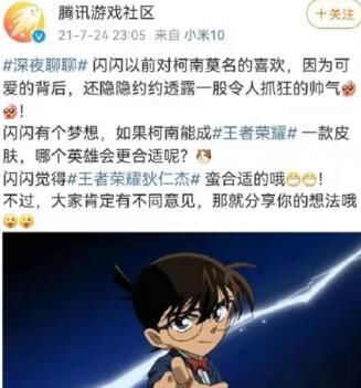 1、这次爆料并不是空穴来风,其实早在2021年7月24日的时候,腾讯游戏社区曾发了一篇关于柯南与王者荣耀的消息。