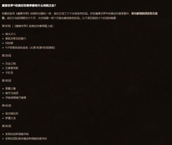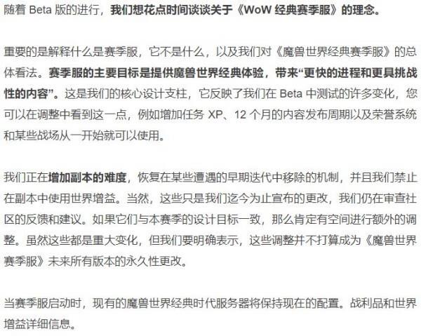 怎么说呢,如下图之中所示,这是游戏方面的更新公告,赛季服其实就是怀旧服的再怀旧模式,也就是套娃模式,玩家们进入赛季服之后将再次从熔火之心开始重新挑战,更新速度为12个月为一个周期,基本上和暗黑3的轮回服是一个意思。
