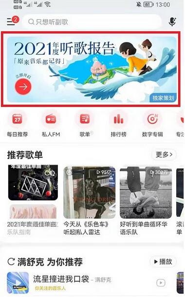 1、首先我们需要进入到网易云音乐中,然后在软件的首页界面中,点击上方的轮播图【2021年度听歌报告】进入到活动中;
