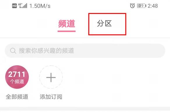 2、在频道页面的上方可以看到频道和分区,点击分区,进入分区页面。
